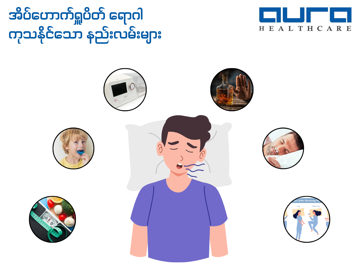 • အခြားအထောက်အကူ ပြုပစ္စည်းများ : ခေါင်းအုံး မြင့်မြင့်အိပ်ခြင်း၊ ဟောက်ခြင်း ကာကွယ်သည့် ကိရိယာများ သို့မဟုတ် နှာခေါင်းကပ်ခွာများ အသုံးပြုခြင်း။